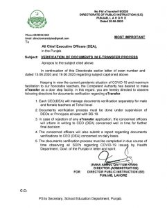 کرونا کی صورتحال کو مد نظر رکھتے ہوئے اساتذۂ کی آسانی اور خفاظت کے لئے یہ فیصلہ کیا گیا ہے کہ ای ٹرانسفر کے لئے دستاویزات کی تصدیق تحصیل کی سطح پر کی جائے گی