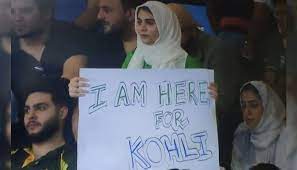 گزشتہ اتوار کو پاک بھارت ٹاکرے کے دوران دبئی اسٹیڈیم میں بھارتی سابق کپتان کوہلی کی ایک پاکستانی فین نے پلے کارڈ اٹھایا ہوا تھا جو کہ سوشل میڈیا پر پاکستان سمیت سرحد پار بھی کافی مقبول ہو رہا ہے ۔